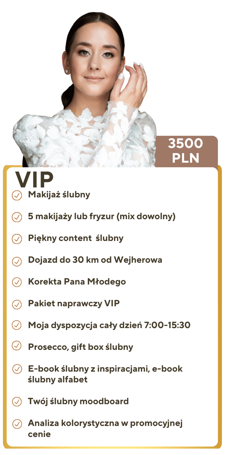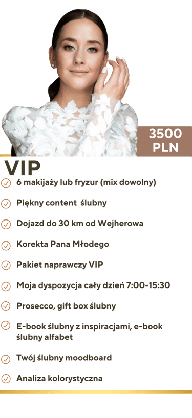 Pakiet VIP oraz pakiet poprawinowy pomogą Ci poczuć się w 100% zaopiekowaną. Stworzę atmosferę profesjonalizmu i ślubnego perfekcjonizmu na Twoich przygotowaniach.